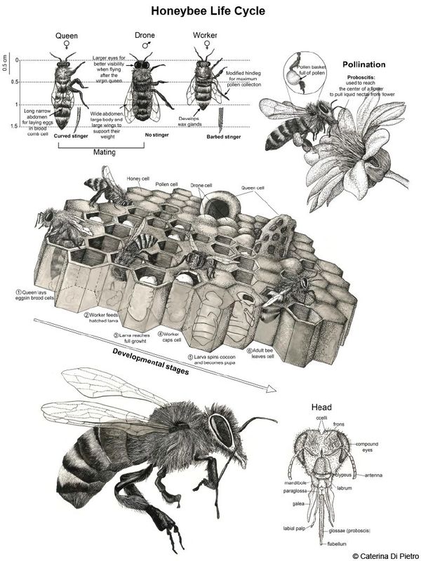 A colony of honey bees contains a queen who lays the eggs, workers who take care of the queen, clean the hive, collect nectar & pollen and drones who live only to mate with virgin queens and don't help in the hive.
